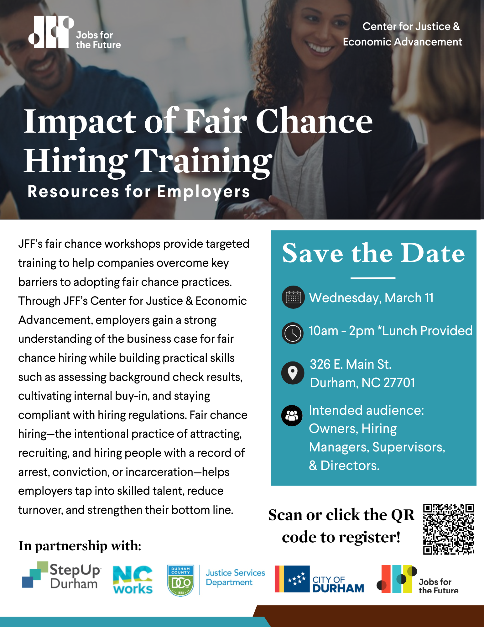 This is going to be fantastic training. It's free. It addresses company needs. Will help revamp hiring policies that may be outdated, and help you feel peace about fair chance hires. We'll deal with concrete numbers, statistics, and practical ways forward. Also, your company will be making a meaningful difference. This is a first-time collaboration with local organizations and Jobs for the Future here in Durham.